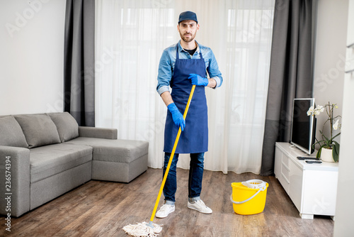 Portrait of a man as a professional cleaner in blue uniform washing floor with mopping stick and bucket in the living room of the apartment