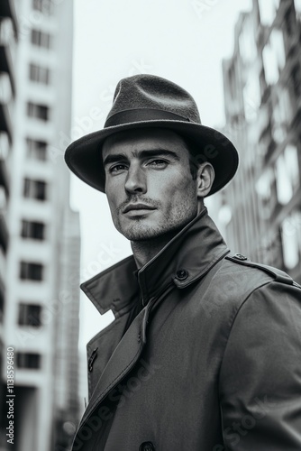 Portrait of a man in a fedora and trench coat, standing confidently in a cityscape, exuding classic urban elegance.