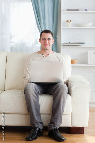 Portrait of a man using a laptop while sitting on a sofa