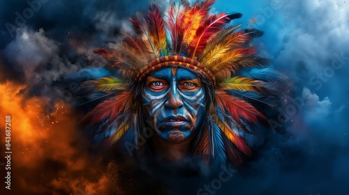 Portrait of a man wearing a colorful feathered headdress with blue tribal face paint, surrounded by vibrant smoke.