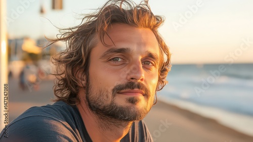 Portrait of a Man with Windblown Hair on a Sunset Beach