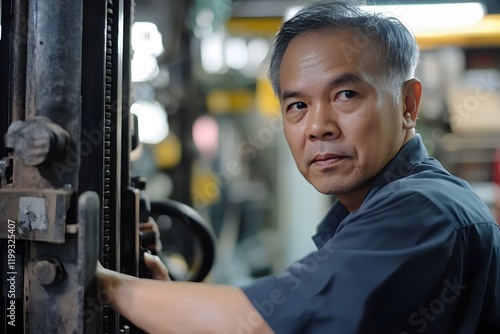 Portrait of a Mature Asian Male Factory Worker Operating Industrial Machinery Serious Expression Hardworking Manufacturing Industry Professional Skilled Laborer