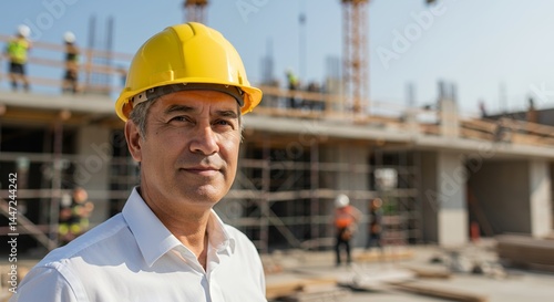 Portrait of a mature male construction worker wearing a yellow hard hat, standing confidently on a building site, looking directly at the camera with a focused expression.