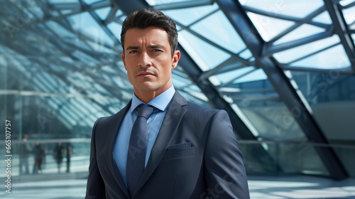 Portrait of a mid adult Mexican businessman in front of a modern corporate glass building