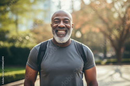 Portrait of a middle age body positive african american man in sporty clothes smiling after running in the city park
