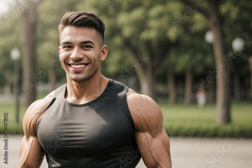 Portrait of a muscular man happily walking in the park.