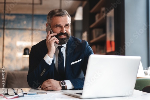Portrait of a nice smiling man with beard, he is sitting at table, talking on the phone with his laptop