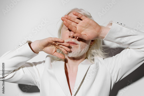 Portrait of a person with long white hair and beard, wearing a white suit, posing with hands in front of face against a light background, showcasing elegance and emotion