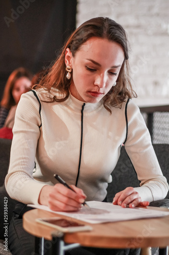 Portrait of a pretty young business lady working in a cafe. Papers, telephone conversations, laptop and coffee in the coworking area