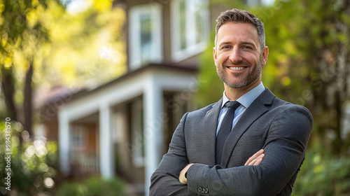 Portrait of a real estate agent, traditional house background, confident and welcoming