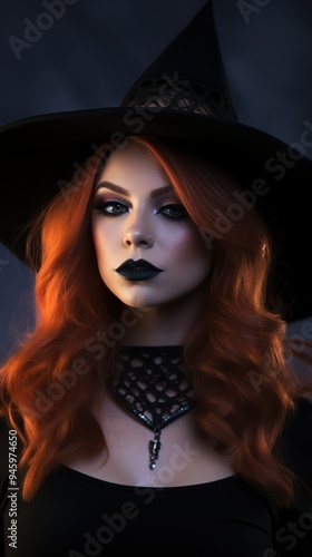 Portrait of a red-haired witch with dark makeup, including black lipstick, and wearing a black hat. The soft lighting contrasts with the deep shadows, creating a moody, enigmatic atmosphere