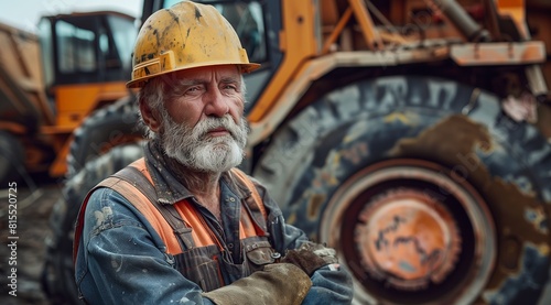 Portrait of a rugged construction worker in overalls and a hard hat, with a backdrop of heavy machinery. The worker's seasoned face and reflective gaze convey a sense of experience