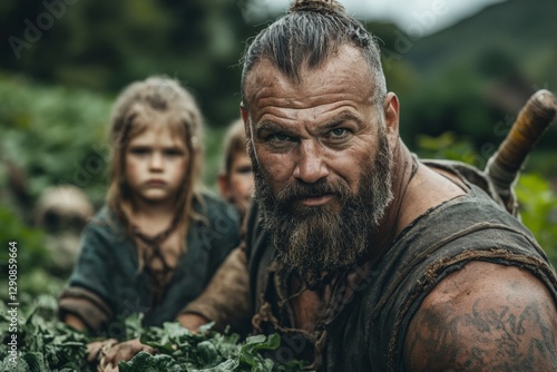 Portrait of a rugged man with children in a lush green landscape during daytime