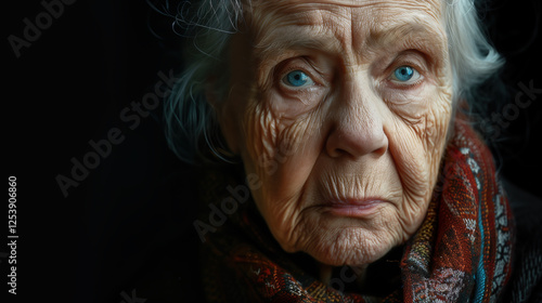 Portrait of a sad old woman against a black background. Horizontally.