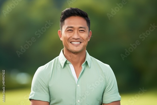 Portrait of a satisfied asian man in his 30s smiling at the camera in front of pastel green background