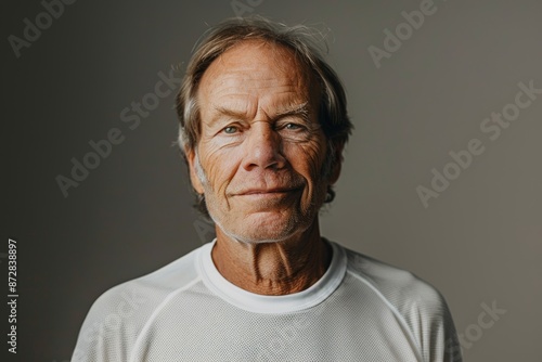 Portrait of a satisfied caucasian man in his 50s sporting a breathable mesh jersey over soft gray background