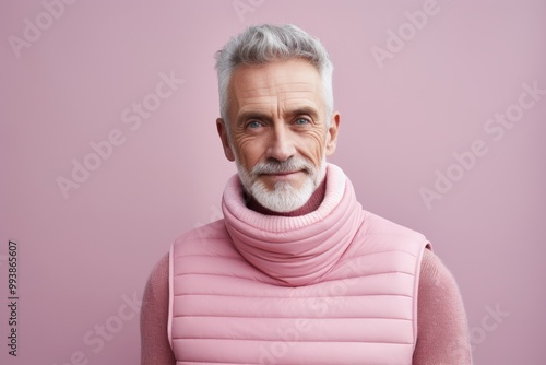 Portrait of a satisfied man in his 50s dressed in a thermal insulation vest isolated on pastel or soft colors background