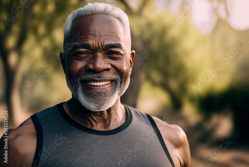 Portrait of a senior. Black man stretching outdoors. Senior fitness exercise. Fictional person, Generative AI