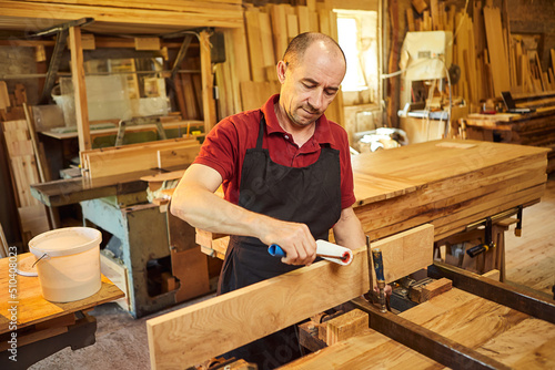 Portrait of a senior carpenter in uniform gluing wooden bars with hand pressures at the carpentry manufacturing