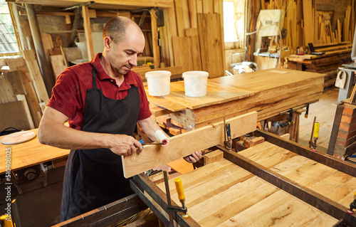 Portrait of a senior carpenter in uniform gluing wooden bars with hand pressures at the carpentry manufacturing