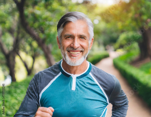 Portrait of a Senior Male Jogger Running in a Park on a Health Trail. Healthy and Fit Elderly Man Enjoying Physical Activity and Staying in Shape