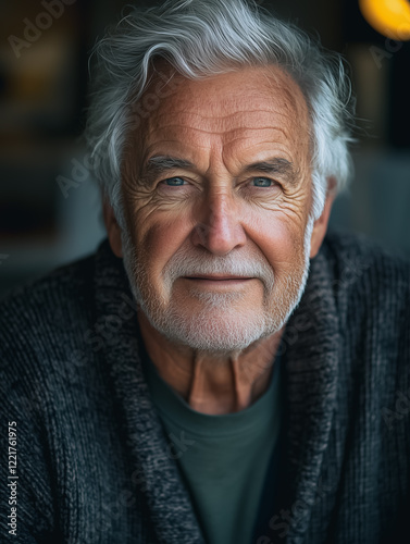 Portrait of a Senior Man: A captivating close-up portrait of a mature man with silver hair and a warm, gentle smile. His kind eyes and weathered face tell a story of life experiences, wisdom.