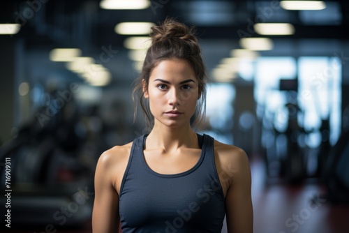 Portrait of a serious girl in her 30s doing step in a gym. With generative AI technology