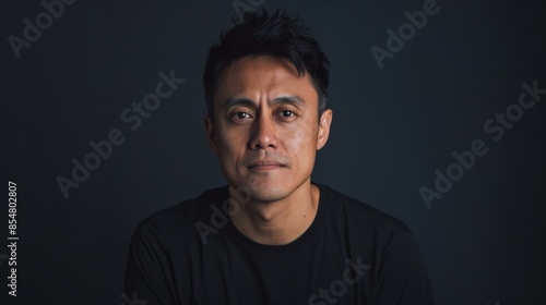 Portrait of a serious man in a dark setting, gazing directly at the camera with a neutral expression