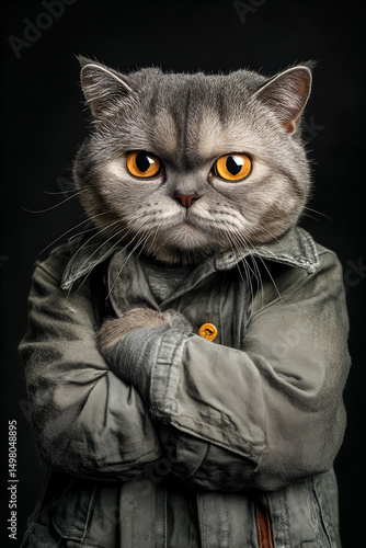 Portrait of a serious scottish fold cat in military-style jacket with intense golden eyes against dark background.