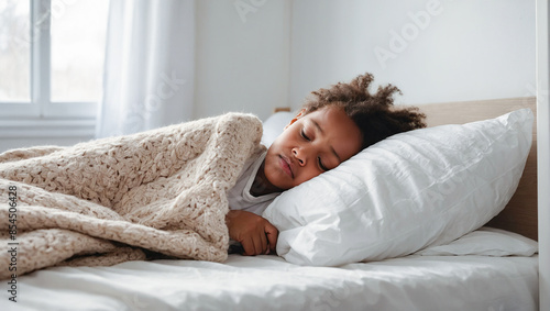 Portrait of a sick or tired African American child lying in a white bed at home. Sleeping kid