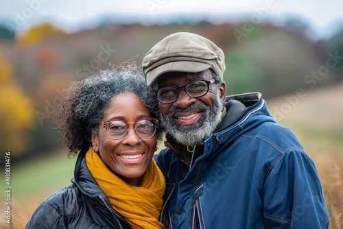 Portrait of a smiling afro-american couple in their 60s wearing a windproof softshell in backdrop of an idyllic countryside
