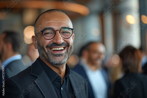 Portrait of a Smiling Arab Man with Eyeglasses, Stylish Beard, and Surrounded by Businesspeople