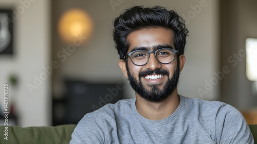 Portrait Of A Smiling Bearded Man With Glasses In A Gray Shirt Sitting On A Green Couch Indoors In A Modern Home With Soft Lighting