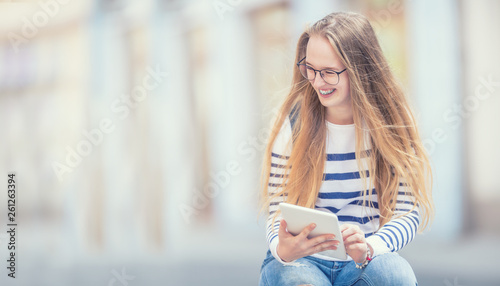 Portrait of a smiling beautiful teenage girl with dental braces. Young schoolgirl with school bag and tablet device