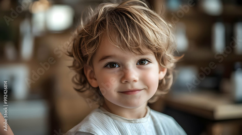 Portrait of a smiling boy with curly hair, natural lighting, warm tones, cozy environment.