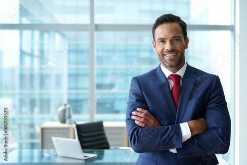 Portrait of a smiling businessman in a blue suit with arms crossed in an office space