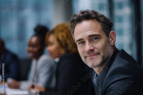 Portrait of a smiling businessman in a modern office setting, exuding confidence and success.