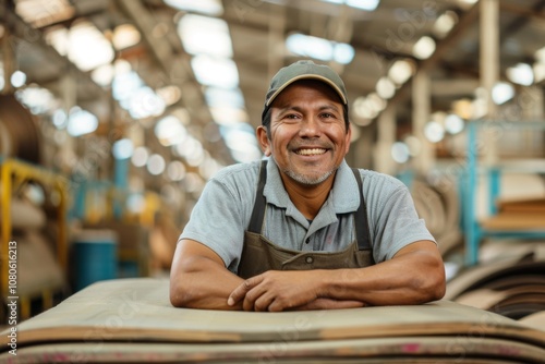 Portrait of a smiling Hispanic worker inside large Furniture factory and interior woof items building factory