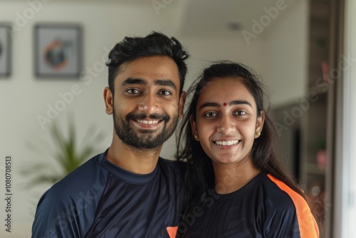 Portrait of a smiling indian couple in their 20s sporting a breathable mesh jersey over modern minimalist interior