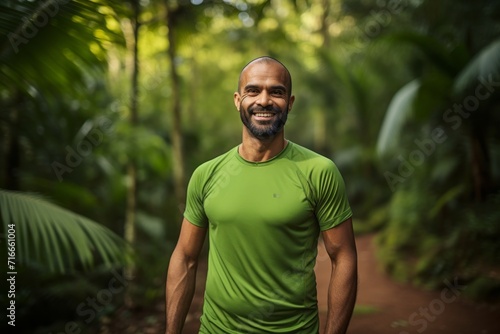 Portrait of a smiling indian man in his 40s wearing a moisture-wicking running shirt against a lush tropical rainforest. AI Generation