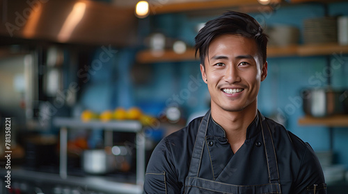 Portrait of a smiling male chef in a professional kitchen setting, wearing a black apron and standing confidently with a blurred background.