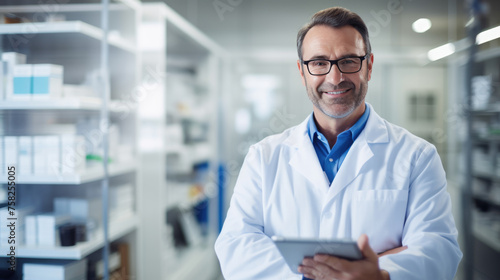 Portrait of a smiling male doctor in a lab coat holding a tablet