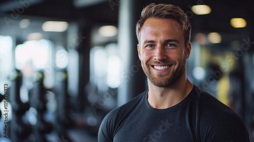 Portrait of a smiling male personal trainer in a gym capturing a cheerful fitness coach in a contemporary sports club setting embodying an active and healthy lifestyle