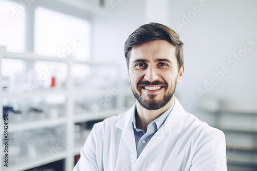 Portrait of a smiling man, doctor or pharmacist standing in a white coat against the background of a pharmacy or doctor's office. Medical services concept. Generative ai