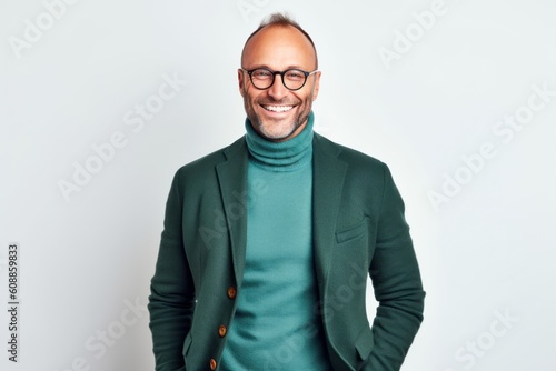 Portrait of a smiling mature man in a green jacket and glasses standing against white background