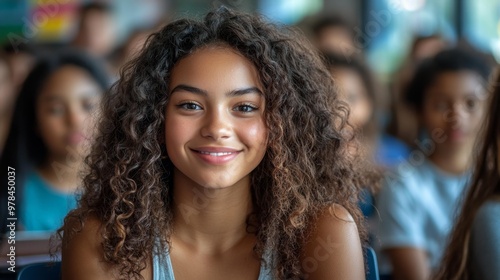 Portrait of a Smiling Teen Girl in a Classroom Generative AI