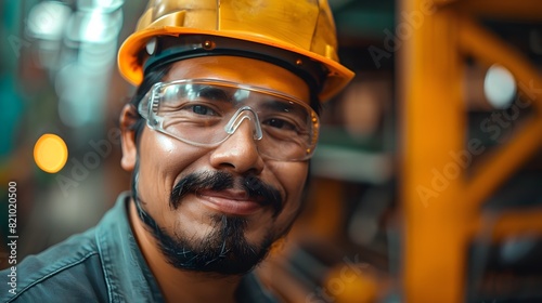 Portrait of a smiling worker with safety glasses and helmet in a factory.