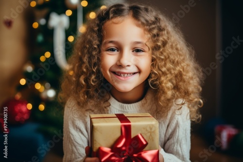 Portrait of a smiling young girl holding Christmas present at home