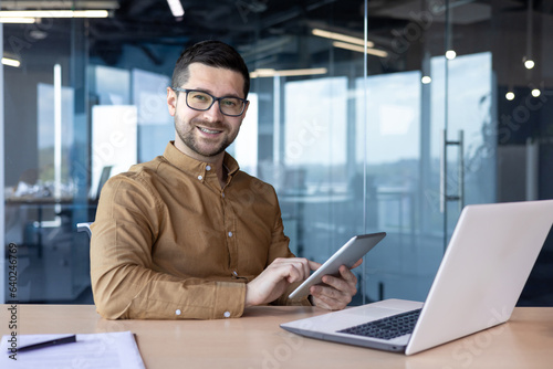 Portrait of a smiling young man working in the office, sitting at the table and holding a tablet in his hands, smiling at the camera