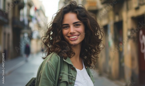 Portrait of a smiling young woman with long brown hair wearing a white shirt and a green jacket. AI.